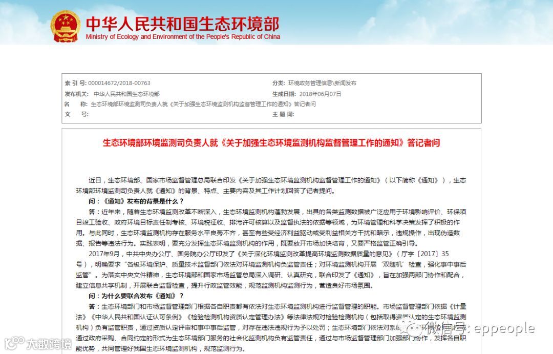 近日,生态环境部、国家市场监督管理总局联合印发《关于加强生态环境监测机构监督管理工作的通知》(以下简称《通知》),生态环境部环境监测司负责人就《通知》的背景、特点、主要内容及其工作计划回答了记者提问。