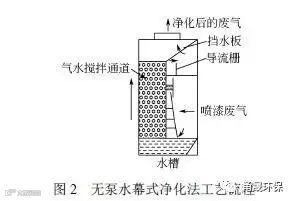 无泵水幕式净化法是利用空气诱导提水形成水幕,当喷漆废气与水幕碰撞后,水幕截留雾状微粒及其携带油漆的水珠;然后废气穿过水帘进入气水搅拌通道,在通道中与水混合;进入集气箱后由于气速降低发生气液分离,净化后的气体排放到大气中,被分离的水在集气箱中汇集流向溢水槽,再通过泛水板形成水幕,循环重复净化喷漆废气,工艺流程如图2所示。相对于水帘式净化法,无泵式净化法去除了水泵设备,优化了净化流程,节约成本和占地面积,同时克服了漆雾黏附管道内壁导致水泵阻塞的现象。