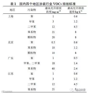 在喷漆涂装过程中高压空气喷射的油漆绝大部分停留在工件上,其他未到达喷涂表面的喷雾微粒与溶解喷漆微粒的水珠悬浮在空气中,以及喷涂过程中产生的挥发性有机化合物形成喷漆废气污染环境。由于不同油漆涂料所用溶剂不同,因而在喷涂过程中产生的废气组分也不同。以汽车喷涂为例检测出15种VOCs,包括苯系物(甲苯、二甲苯等)、酯类(乙酸乙酯、乙酸丁酯等)、酮类(甲基异丁基酮)和醚类(乙二醇丁醚)等。北京、上海、广东、江苏等地针对涂装行业VOCs排放制定了相应标准,见表1。