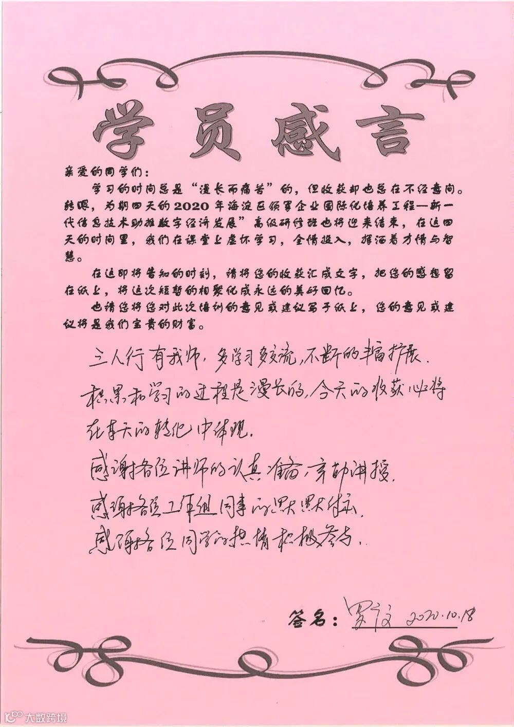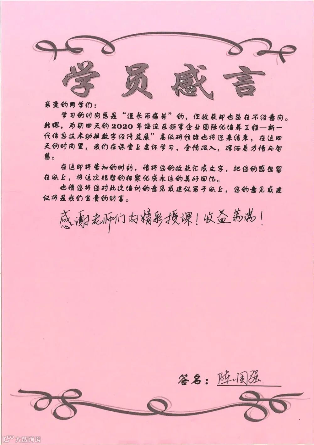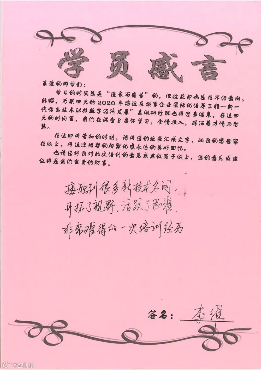四天的授课学习,提升了学员的专业知识水平,并通过学员间的交流互动促进了知识和信息的流通,同时增强了学员间的凝聚力。此次培训班主题鲜明、内容丰富、形式多样,一方面为学员带来了前沿的行业知识,助力学员加深对新一代信息技术产业当前形势和发展趋势的认识,掌握新一代信息技术及应用实践;另一方面通过行业标杆企业参访,开拓了学员们的视野,对学员从智力到实践提供全方位培养支持,为推进海淀区建设领军人才队伍贡献一份力量。