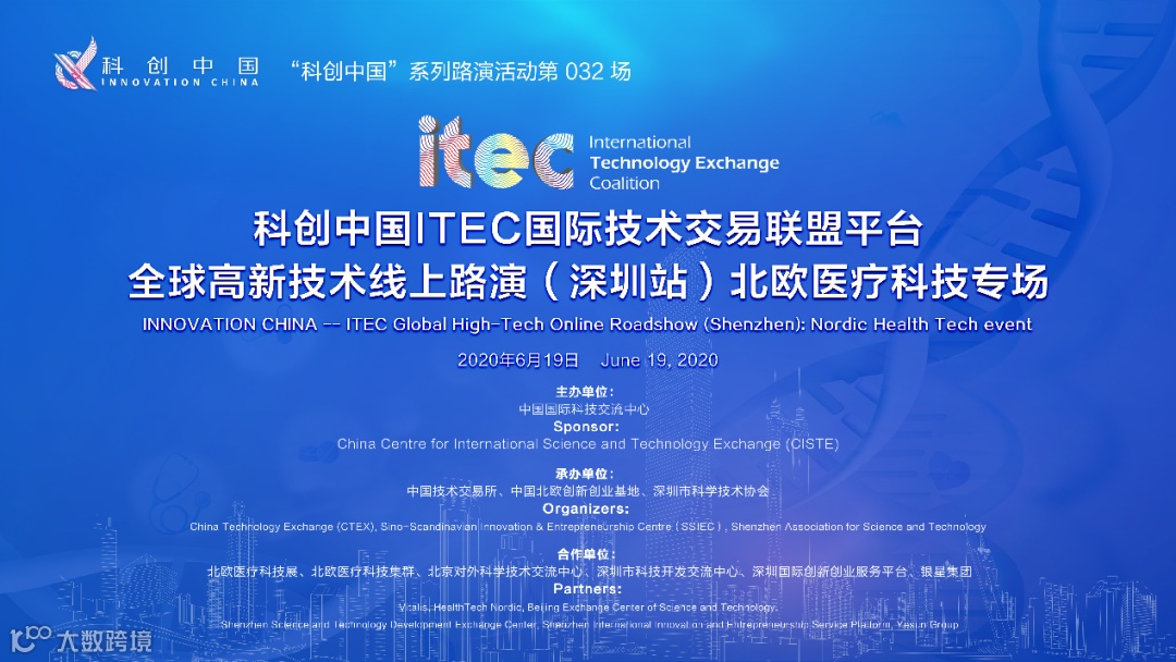 为贯彻落实中央关于构建国内国际双循环相互促进新发展格局的要求,按照中国科协服务科技经济融合发展行动方案的部署,中国国际科技交流中心联合中国技术交易所定于6月19日举办科创中国技术路演第32场—ITEC国际技术交易联盟平台全球高新技术线上路演(深圳站)北欧医疗科技专场。本次路演将发布北欧国家医疗技术领域的优质项目,并邀请北欧医疗科技集群、北欧各驻华使馆、学会、企业园区、投融资机构的代表、专家给与点评,共同促进技术项目对接。