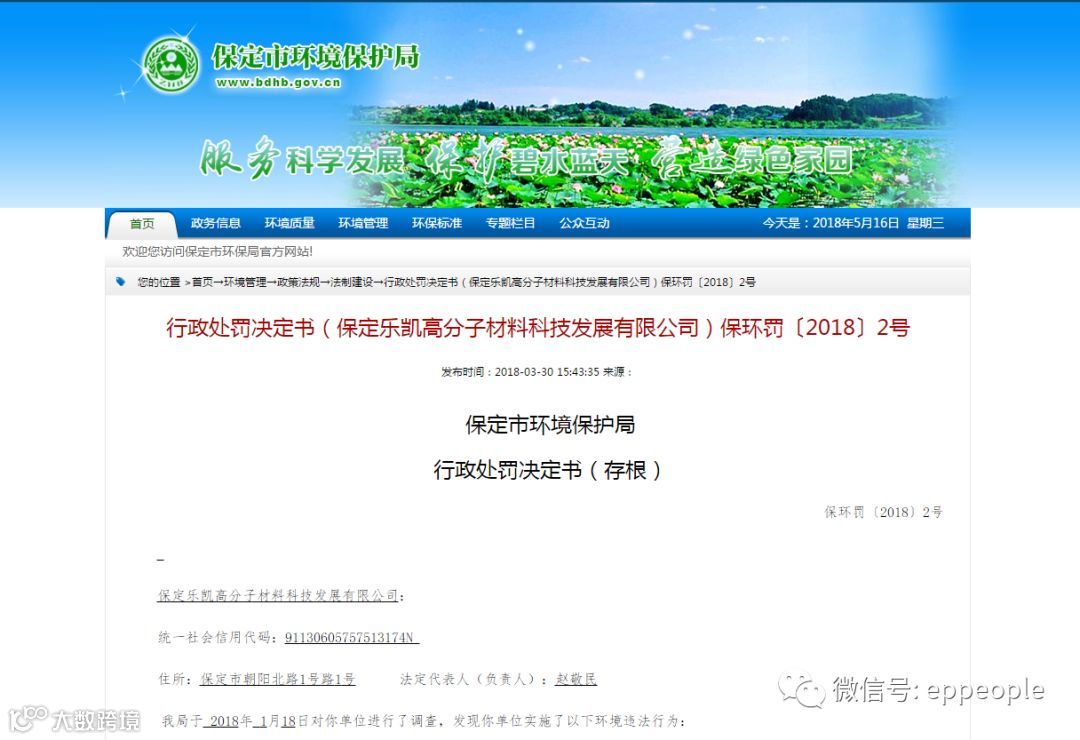 行政处罚决定书(保定乐凯高分子材料科技发展有限公司)保环罚〔2018〕2号