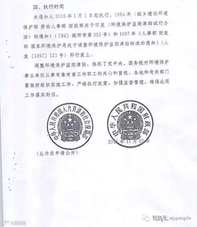 人力资源和社会保障部联合财政部印发了《关于调整环境保护监测津贴的通知》(人社部发[2015]100号),并于2016年1月1日执行。