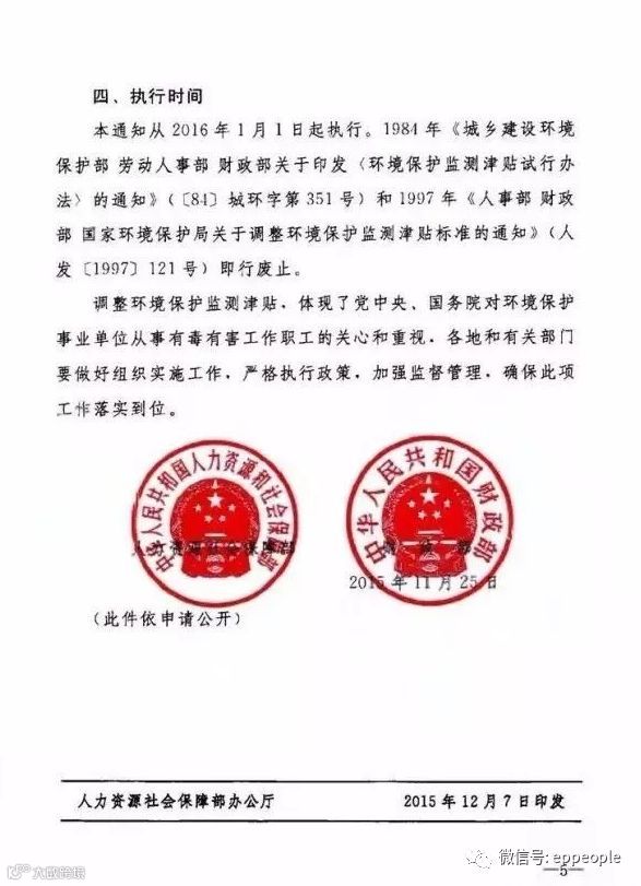 2015年11月25日,人社部和财政部联合印发了《关于调整环境保护监测津贴的通知》(人社部发[2015] 10号),对环境保护监测津贴进行调整。