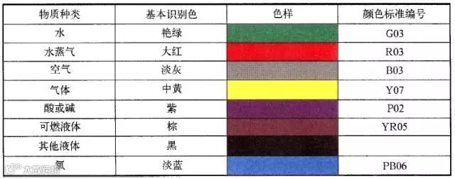 我国现行的是:GB7231-2003《工业管道的基本识别色、识别符号和安全标识》,适用于工业生产中非地下埋设的气体和液体的输送管道。