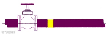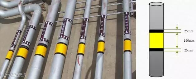 在管道上涂150mm宽黄色,在宽黄色两侧各涂25mm宽黑色的色环或色带。