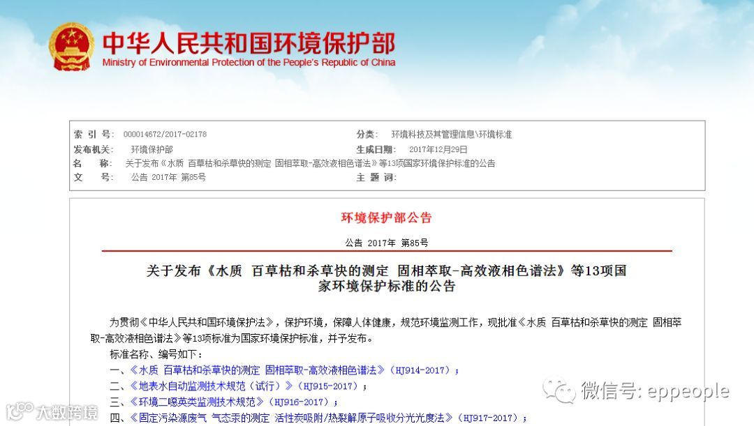 为贯彻《中华人民共和国环境保护法》,保护环境,保障人体健康,规范环境监测工作,现批准《水质 百草枯和杀草快的测定 固相萃取-高效液相色谱法》等13项标准为国家环境保护标准,并予发布。