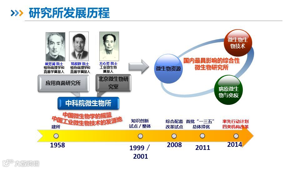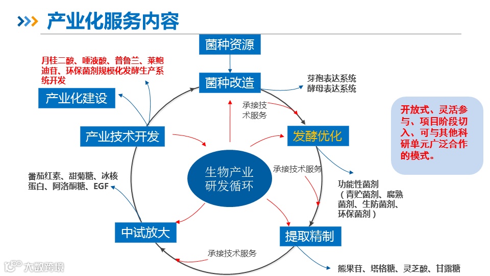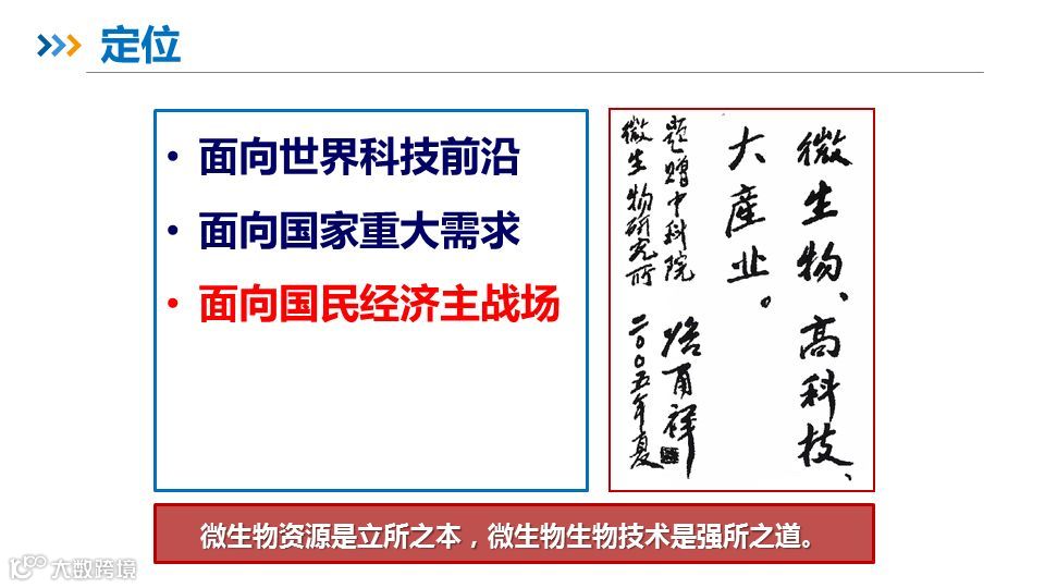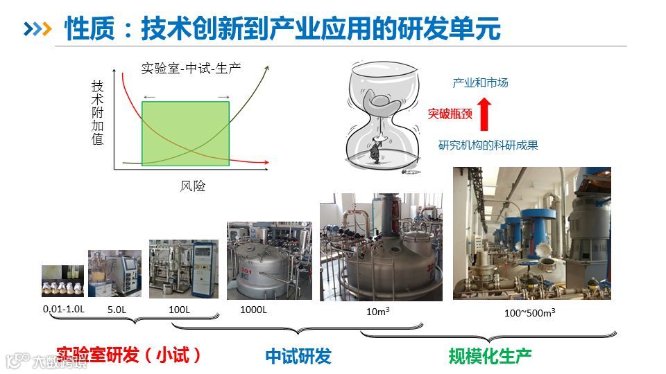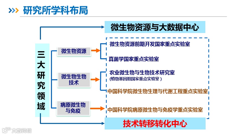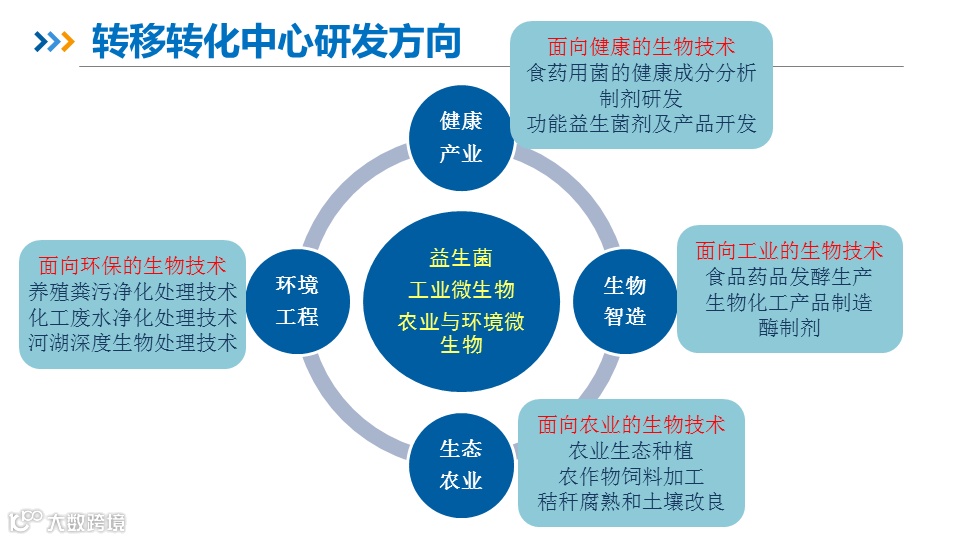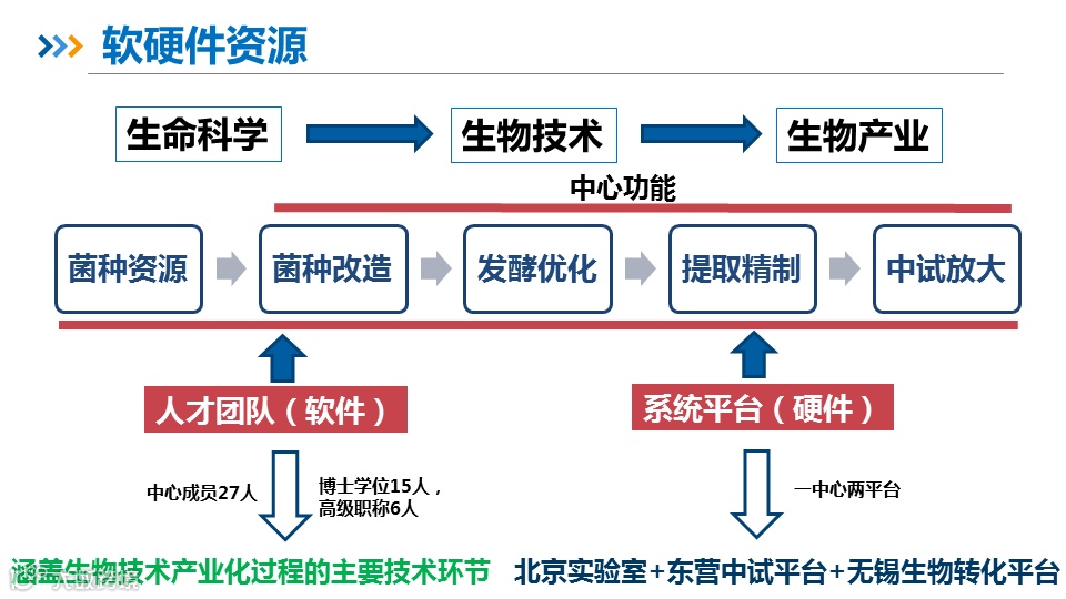 中科院微生物研究所技术转移转化中心是科技部批准的国家级技术转移示范机构。中心围绕生物产业共性技术,通过成果的中试放大与产业衔接,致力于将科研成果转化为实际生产力,提升生物产业的创新能力和竞争力。中心按照技术产业化的规律,配备有跨学科专业的研发队伍及经验丰富的工程技术人员,包括10余位博士,并拥有现代化的仪器设备,可以满足绝大多数生物产业项目的产业化技术开发和工艺放大。中心目前研发的项目集中在生物智造,大健康,生态农业和环境工程四个领域。