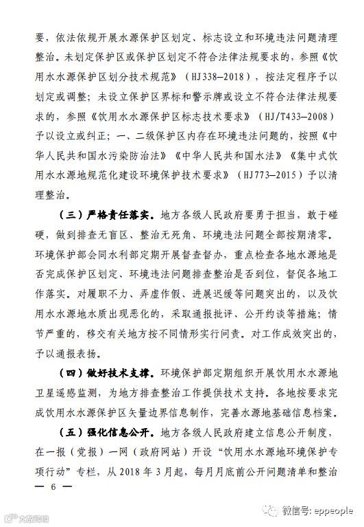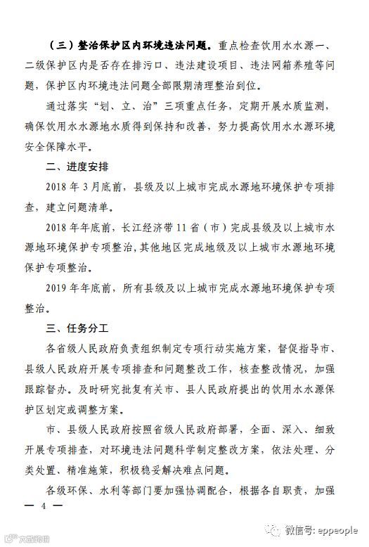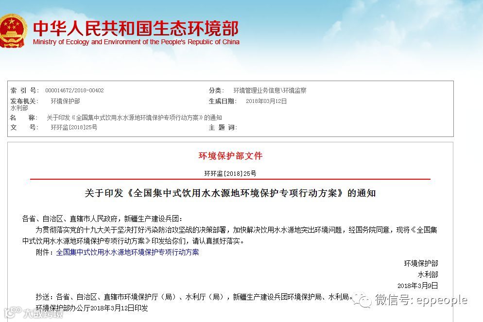 为贯彻落实党的十九大关于坚决打好污染防治攻坚战的决策部署,加快解决饮用水水源地突出环境问题,经国务院同意,现将《全国集中式饮用水水源地环境保护专项行动方案》印发给你们,请认真抓好落实。