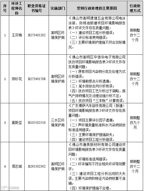 2018年第二季度受到佛山市各级环保部门行政处理的环评工程师名单