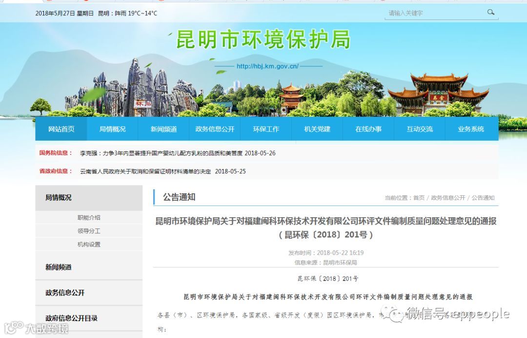昆明市环境保护局关于对福建闽科环保技术开发有限公司环评文件编制质量问题处理意见的通报(昆环保〔2018〕201号)