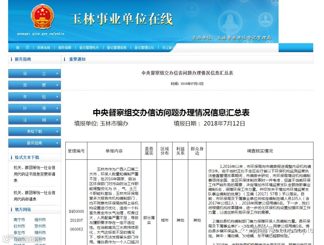 填报单位: 玉林市编办 填报日期: 2018年7月12日