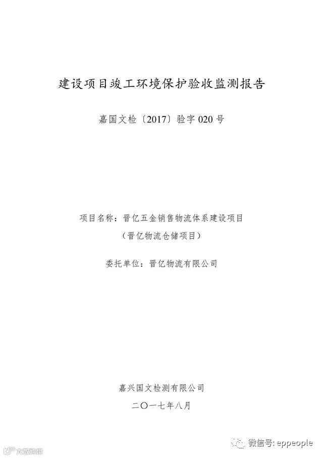 2017年8月18日,晋亿物流有限公司组织召开晋亿五金销售物流体系建设项目(晋亿物流仓储项目)竣工环保设施验收现场检查会。验收小组由属地政府(嘉善经济开发区管委会)、工程建设单位(嘉善荣达建安公司)、环评单位(嘉兴求是环境工程咨询有限公司)、监测单位(嘉兴国文检测有限公司)并特邀3名专家(名单附后)组成。