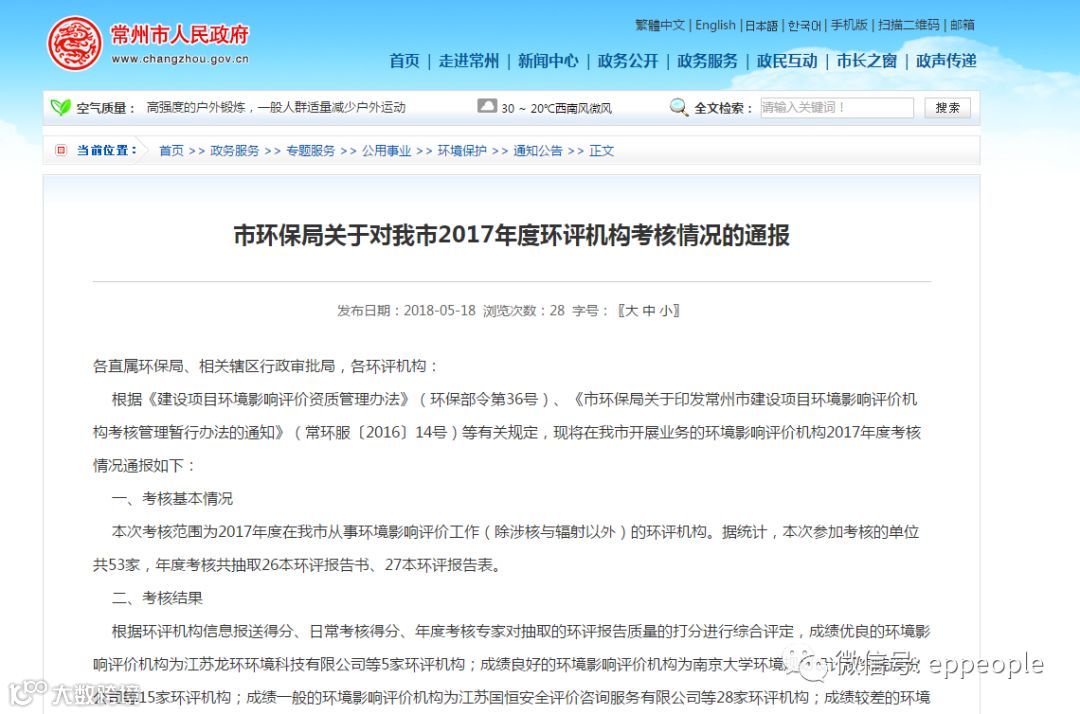 常州市环保局关于对我市2017年度环评机构考核情况的通报