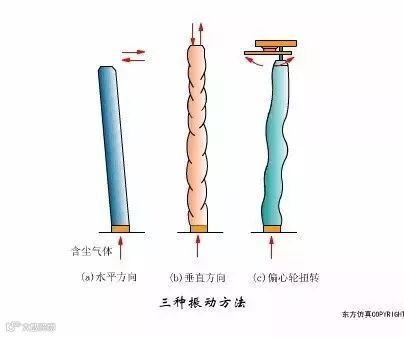(c)为扭曲振动,它利用机械传动装置定期将滤袋扭转一定角度,使尘粒脱落。