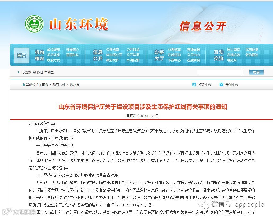 山东省环境保护厅关于建设项目涉及生态保护红线有关事项的通知鲁环发〔2018〕124号