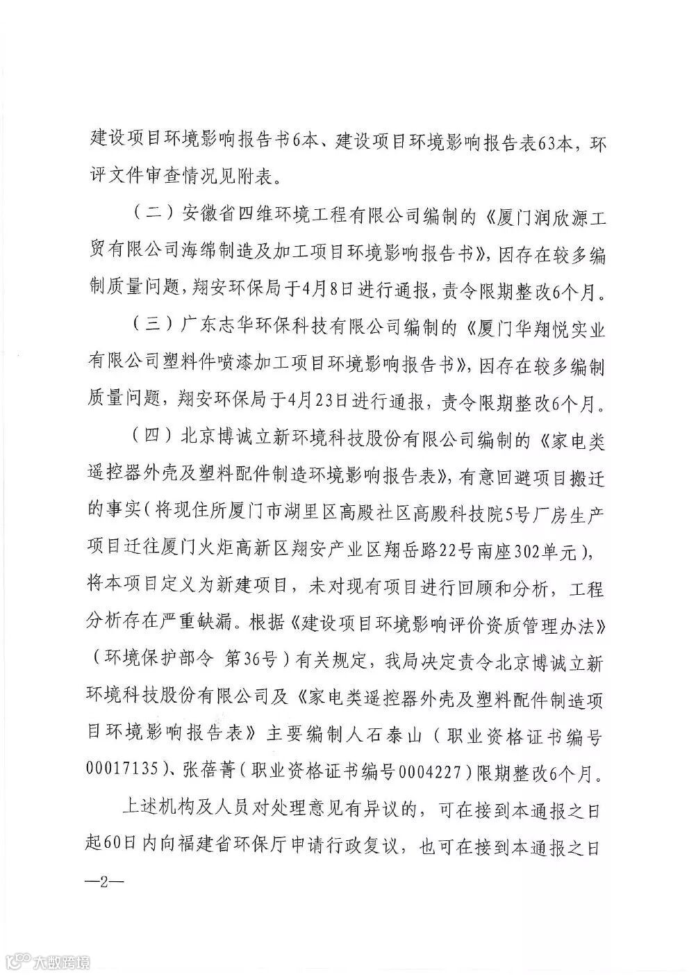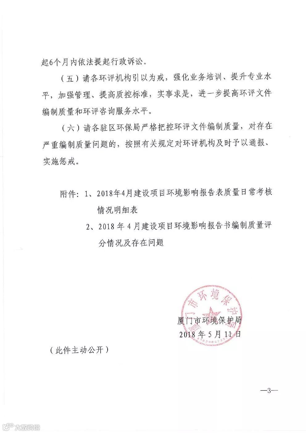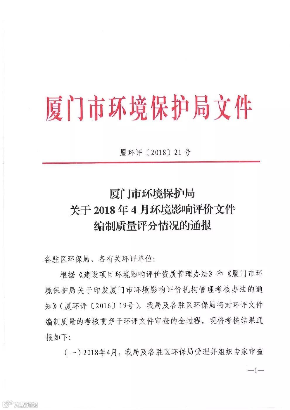 厦门市环境保护局关于2018年4月环境影响评价文件编制质量评分情况的通报