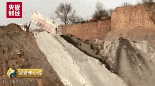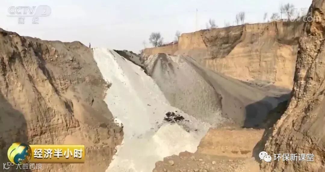 伴随着发动机的轰鸣声,卡车的后斗被抬起,一整车白色工业废渣被倾倒在一个巨大的深坑里,灰色和白色两种工业废渣沿着卡车停过的位置滚落至坑底,从远处看,好似两种不同颜色的“瀑布”。