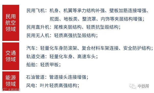 民用飞机:机身、机翼等承力结构补强、壁板加筋连接增强、舵面、地板类、整流罩、内饰灯阶层结构增强; 民用直升机:尾椎夹层结构、轻质抗坠毁结构; 民用无人机:轻质高强抗坠毁结构; |