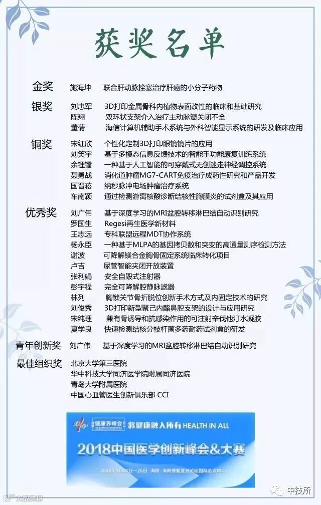 4月26日, 由中国医学创新联盟(CMIA)联合健康界传媒、中国技术交易所共同主办的“2018首届中国医学创新大赛总决赛暨颁奖典礼”在海南博鳌亚洲论坛隆重举行。复旦大学附属中山医院心内科主任葛均波院士、国家卫生健康委员会科教司规划处刘桂生处长、中国技术交易所郭书贵总裁等领导出席并讲话。来自各地政府部门、医院、企业、投资机构、媒体记者以及参赛项目等200余人参加了总决赛暨颁奖典礼。