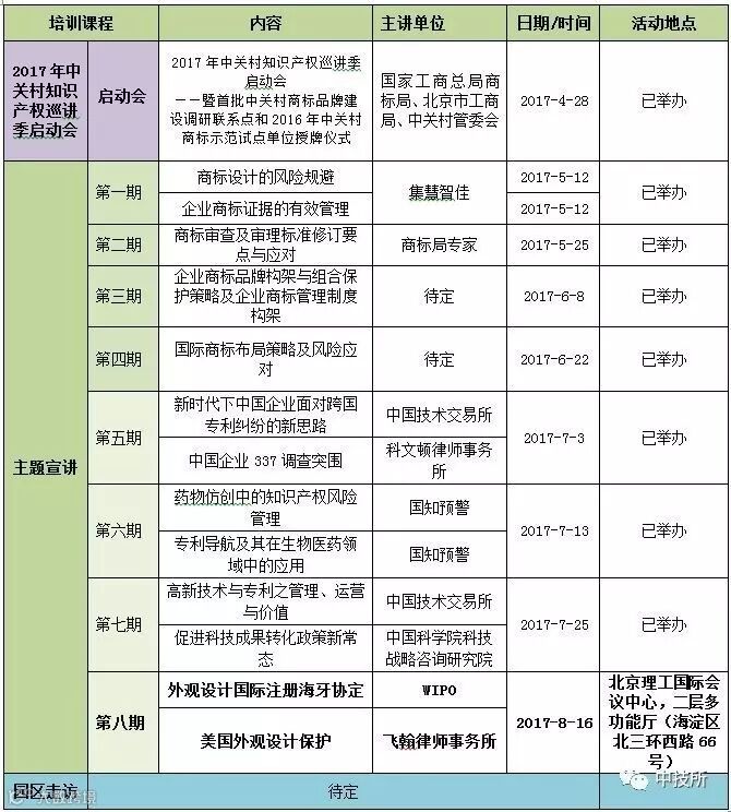 为进一步发挥示范区优秀知识产权服务机构的服务支撑能力,提升示范区企业及各分园知识产权保护意识及工作水平,推动示范区知识产权工作迈上新台阶,2017年将继续开展“中关村知识产权巡讲季”活动。本年度活动拟采取“1+8+N”课程模式,更好服务中关村园区企业:培训方案如下: