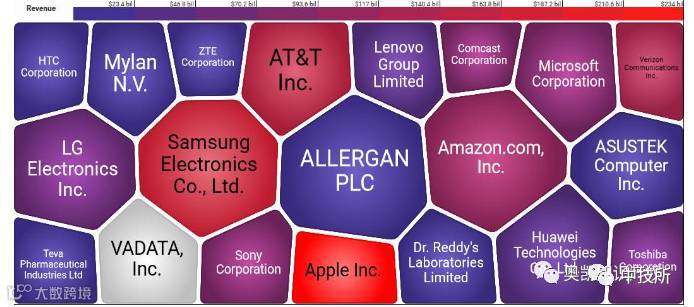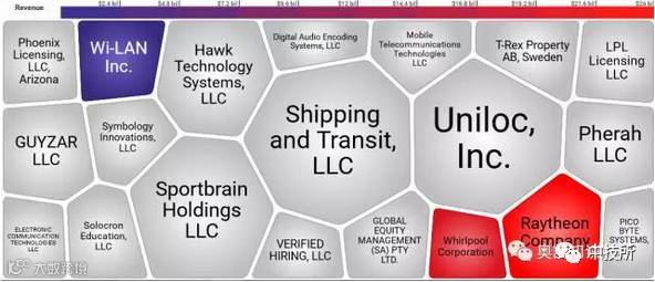 2016年美国专利诉讼的原被告情况如下图所示。在关于原被告的热力图中,方块的大小代表原被告涉及的诉讼案件多少,而方块的颜色代表原被告的财务实力。颜色越红表明原告的财务相对较强,而热力图中灰色的原被告,代表原被告财务未知或者属于NPE。