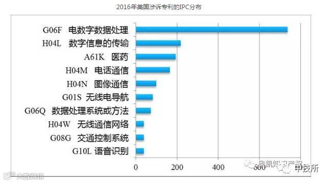 通过统计2016年美国涉诉专利的IPC分布可知,2016年发生在美国的专利诉讼涉及电数字数据处理的最多,其次是数字信息的传输以及医药领域。