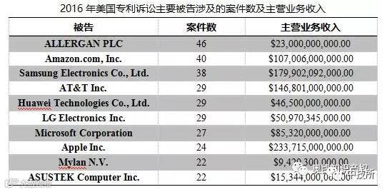 2016年美国专利诉讼的主要被告基本上是上市企业或财务实力雄厚的公司,这与诉讼原告形成强烈对比,涉及专利诉讼最多的被告ALLERGAN PLC,是一家位于爱尔兰都柏林的全球制药公司,该公司在2016年被告达46次。来自中国的华为公司在所有被告中并列排在第4位,涉及的专利诉讼案件达29起。