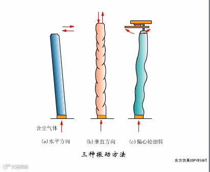 (c)为扭曲振动,它利用机械传动装置定期将滤袋扭转一定角度,使尘粒脱落。
