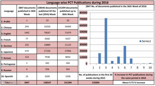 2016年第36周,PCT公开2847件专利申请。在2016年的前36周,已经总共有141394件国际专利申请(2016年多达141394件国际专利)在专利范围数据库中公开。PCT发布的2016年前36周各语种数据同样用一个条形图展示。今年,公开的专利数量相比于2015年增长4.73%。