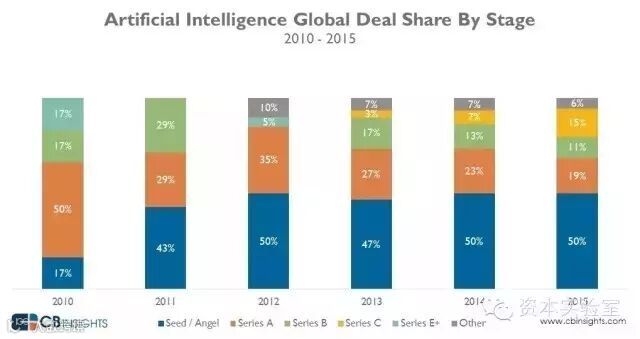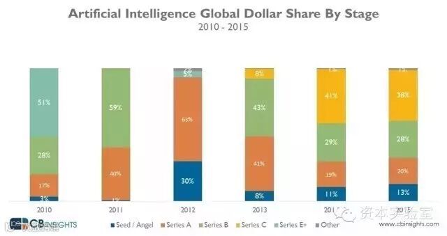 CB Insights对2010-2015年间人工智能领域的投资活动进行了分析,涵盖图像处理、自然语言处理、机器学习、深度学习和预测API,以及其他核心应用程序。