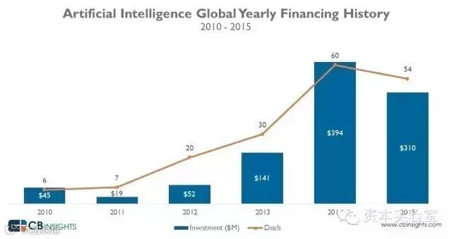 2015年,人工智能领域融资总额3.1亿美元,接近2010年融资总额的7倍。