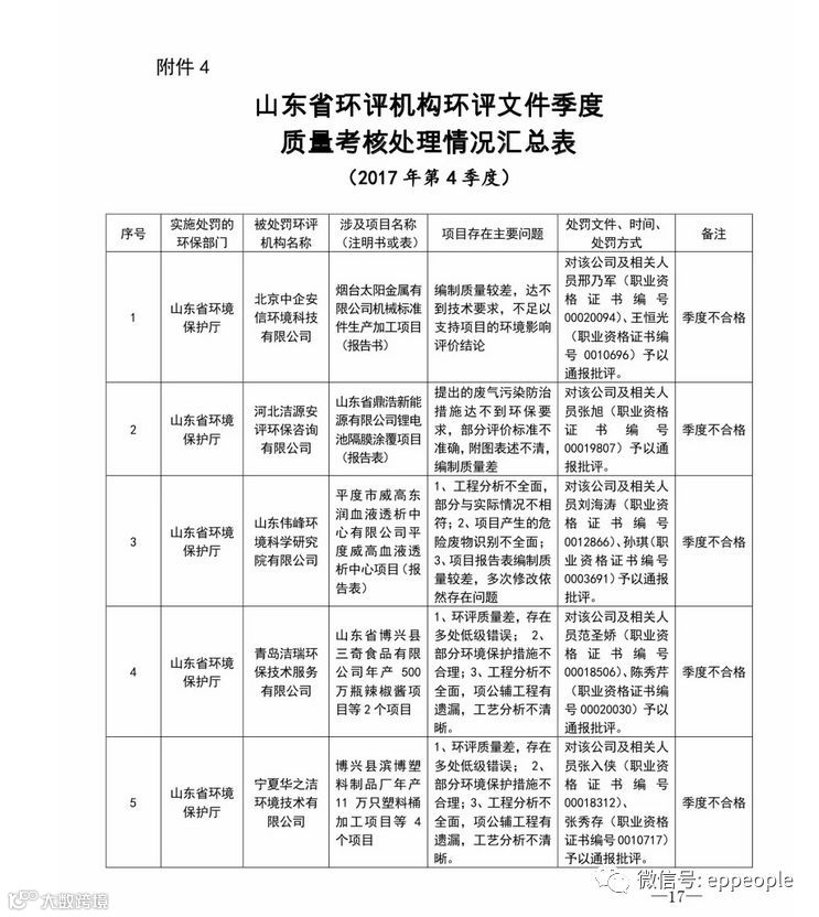 山东省环境保护厅关于2017年第四季度环评机构环评文件质量考核情况及2017年度考核不合格环评机构的通报