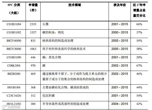 图4:石墨烯专利申请量居前10位的技术领域及其申请情况