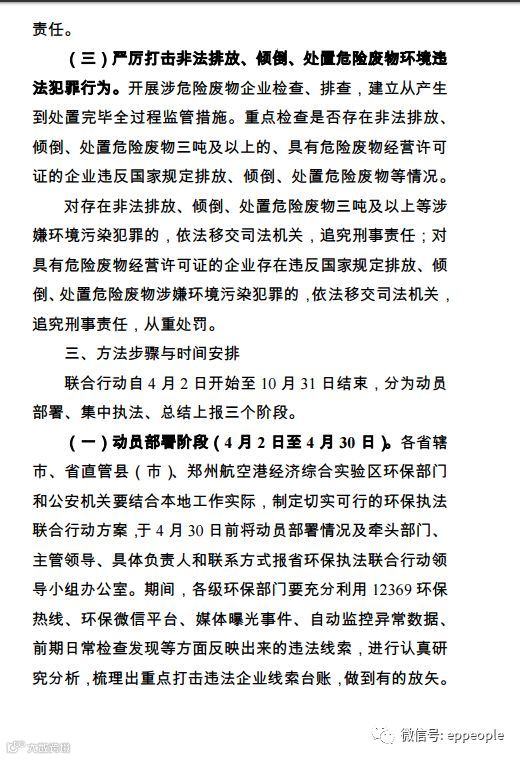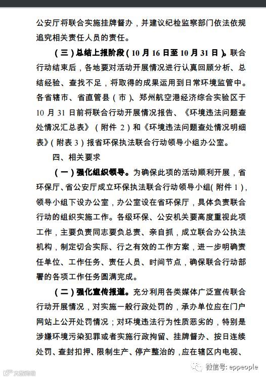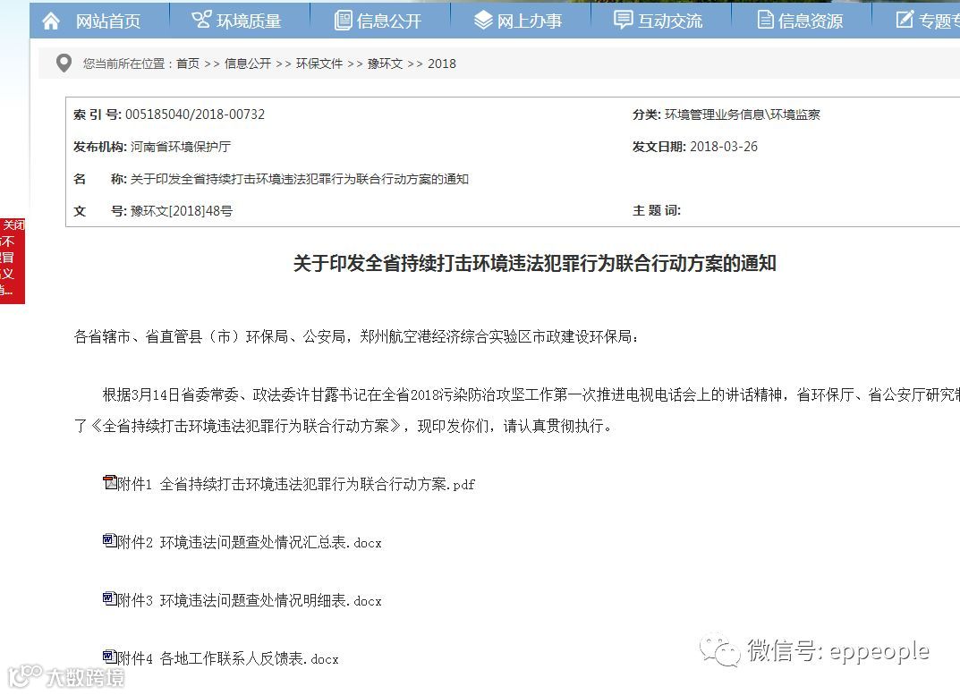 各省辖市、省直管县(市)环保局、公安局,郑州航空港经济综合实验区市政建设环保局:根据3月14日省委常委、政法委许甘露书记在全省2018污染防治攻坚工作第一次推进电视电话会上的讲话精神,省环保厅、省公安厅研究制定了《全省持续打击环境违法犯罪行为联合行动方案》,现印发你们,请认真贯彻执行。附件1 全省持续打击环境违法犯罪行为联合行动方案.pdf附件2 环境违法问题查处情况汇总表.docx附件3 环境违法问题查处情况明细表.docx附件4 各地工作联系人反馈表.docx 河南省环境保护厅 河南省公安厅2018年3月23日 主办:省环境监察总队 督办:省环境监察总队河南省环境保护厅办公室 2018年3月23日印发