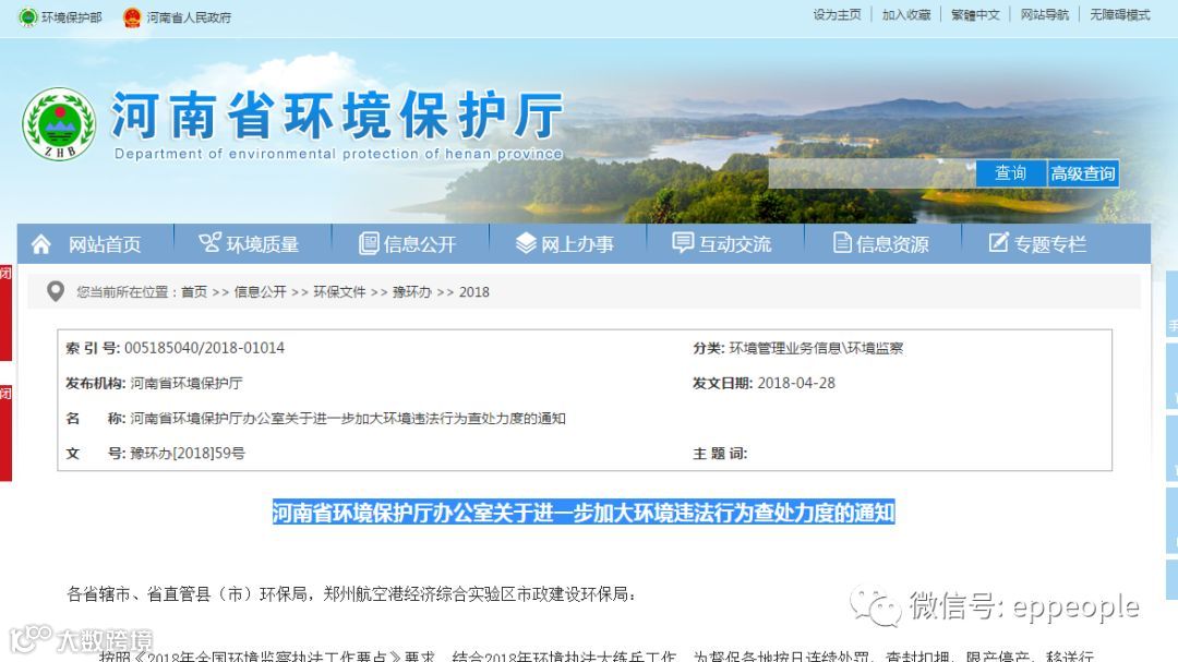 河南省环境保护厅办公室关于进一步加大环境违法行为查处力度的通知