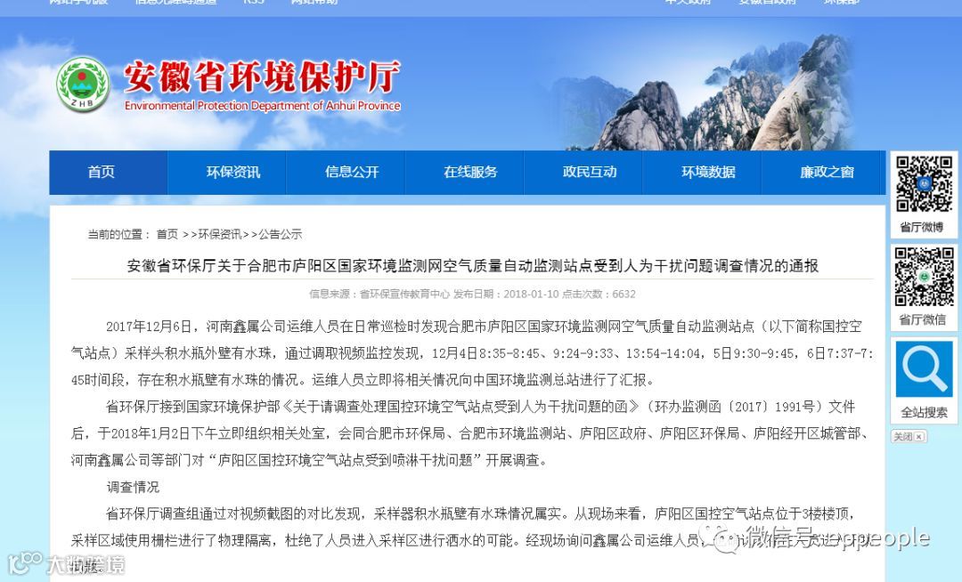 安徽省环保厅关于合肥市庐阳区国家环境监测网空气质量自动监测站点受到人为干扰问题调查情况的通报