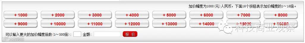 16个按钮为报价加价金额按钮,竞买人可按照相应价格选择加价幅度,您也可以直接下方的输入框内输入您要出价的价格。