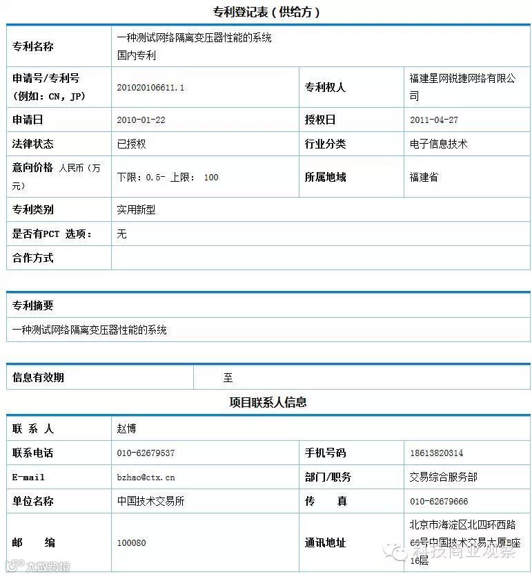 专利登记表中会展示该专利的想信息及联系人信息,该表格中的内容来源于专利信息发布者。