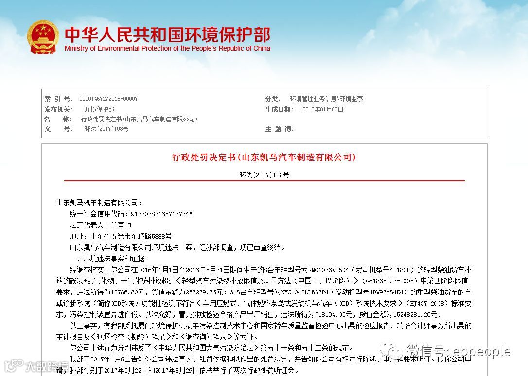 山东凯马汽车制造有限公司环境违法一案,经我部调查,现已审查终结。
