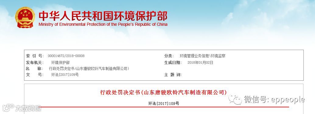 山东唐骏欧铃汽车制造有限公司环境违法一案,经我部调查,现已审查终结。