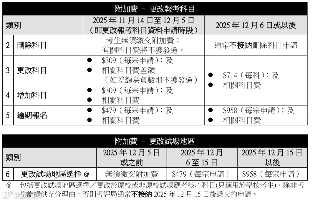 另外,在内地考场报考的考生报名费由2059港元上调至2500港元(+21.4%)。其他附加费如更改报考科目或更改试场地区的费用明细如下: