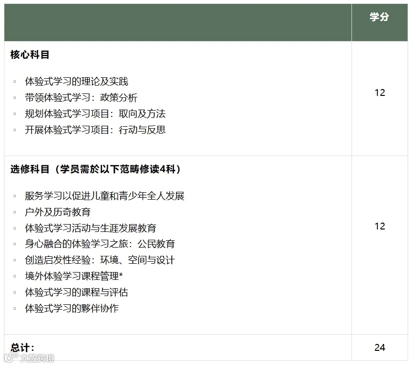 24学分,须完成5门核心课程和3门选修课程。