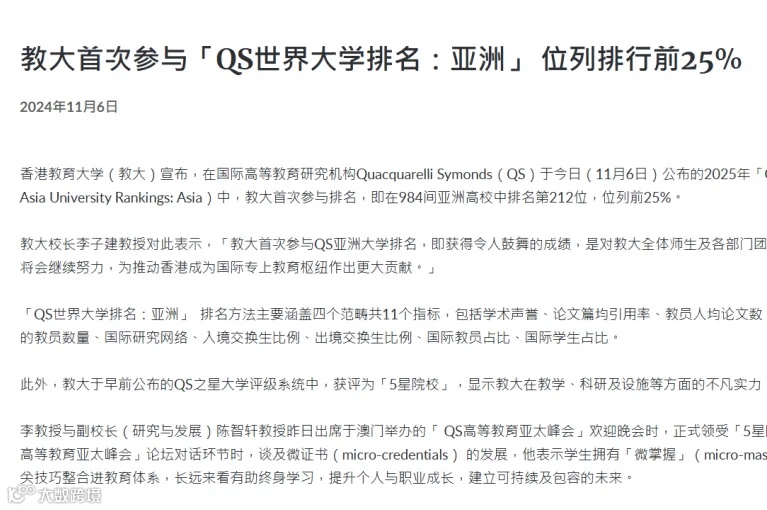 首次跻身2025年QS亚洲大学排行榜,位列亚洲212名;