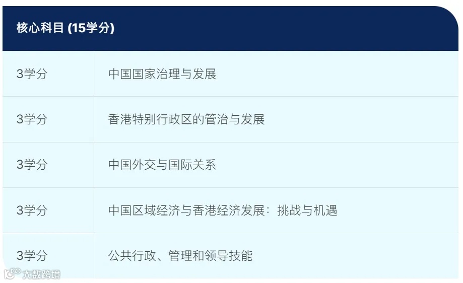 24学分,包含5门核心课程,其中一项为专题研究,和2门选修课程。