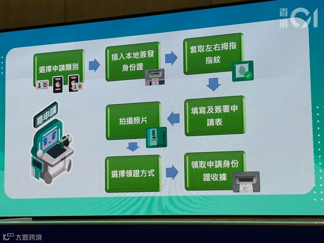 填写和签署电子表格 / 拍摄相片 / 录取指纹 / 递交申请,省掉了面见入境处登记主任的程序。