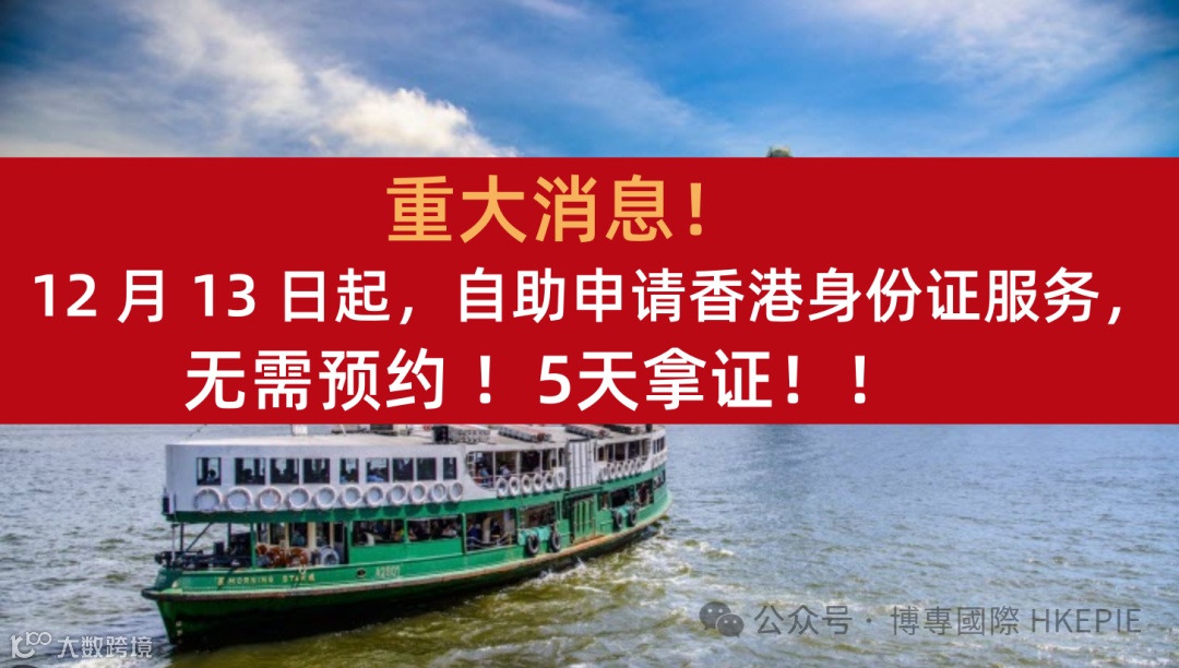 香港入境处宣布 12月13日起 推出自助申请香港身份证服务,不用预约,不用见主任,15分钟 即可完成。