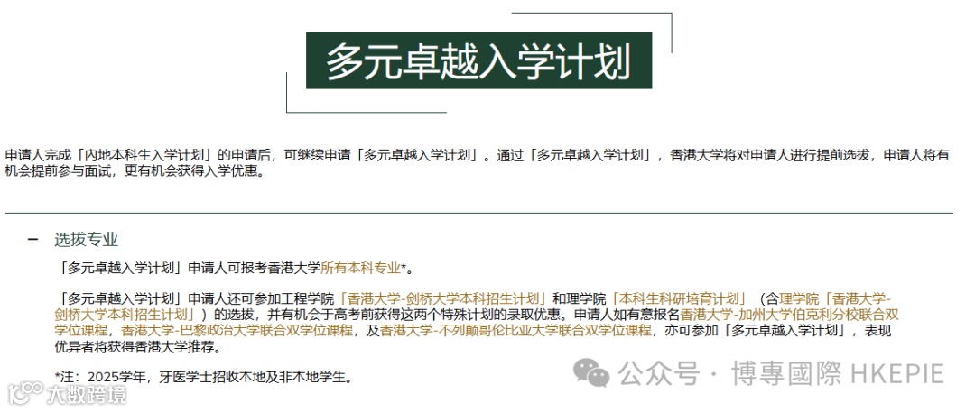 此外,港大对内地高考生十分友好。除了扩招学额外,还推出了专属于高考生的降分录取通道:在特殊领域拥有卓越表现的同学,可以参加多元卓越入学计划,实现低门槛入读!