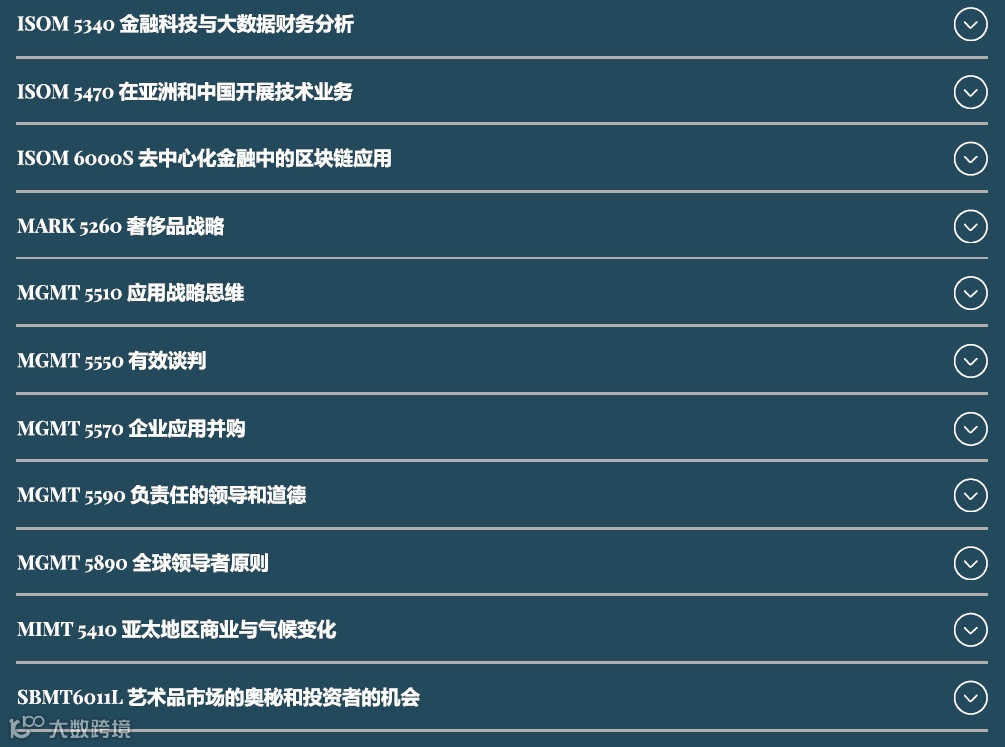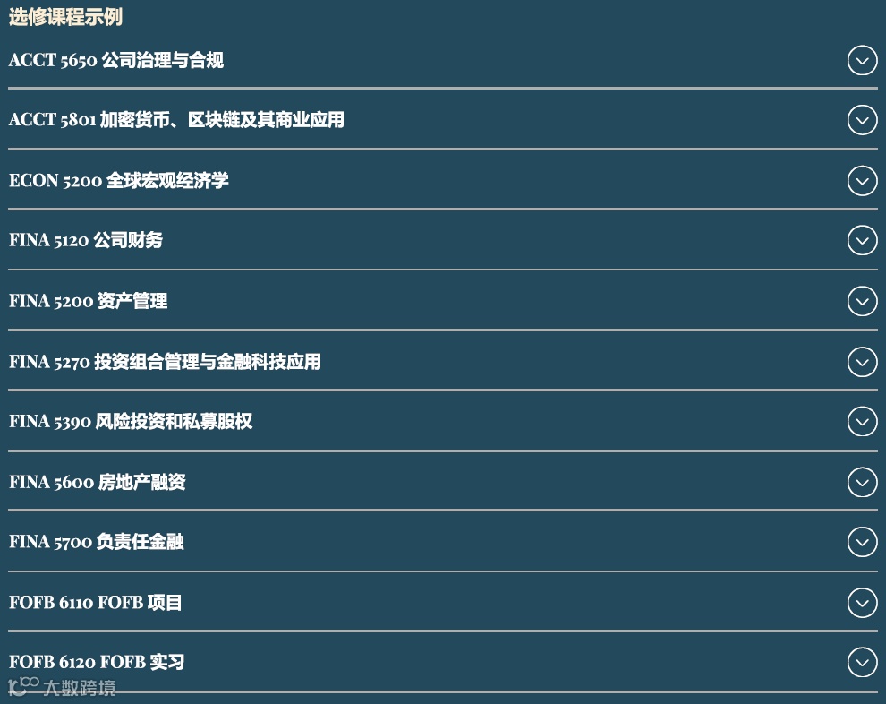 学生要想完成MScFOFB课程必须要修完30个学分(共15门课程),包括5门必修课(每门2学分)、10门选修课(每门20学分),学生最多可以修读34个学分(额外的4个学分免费)。