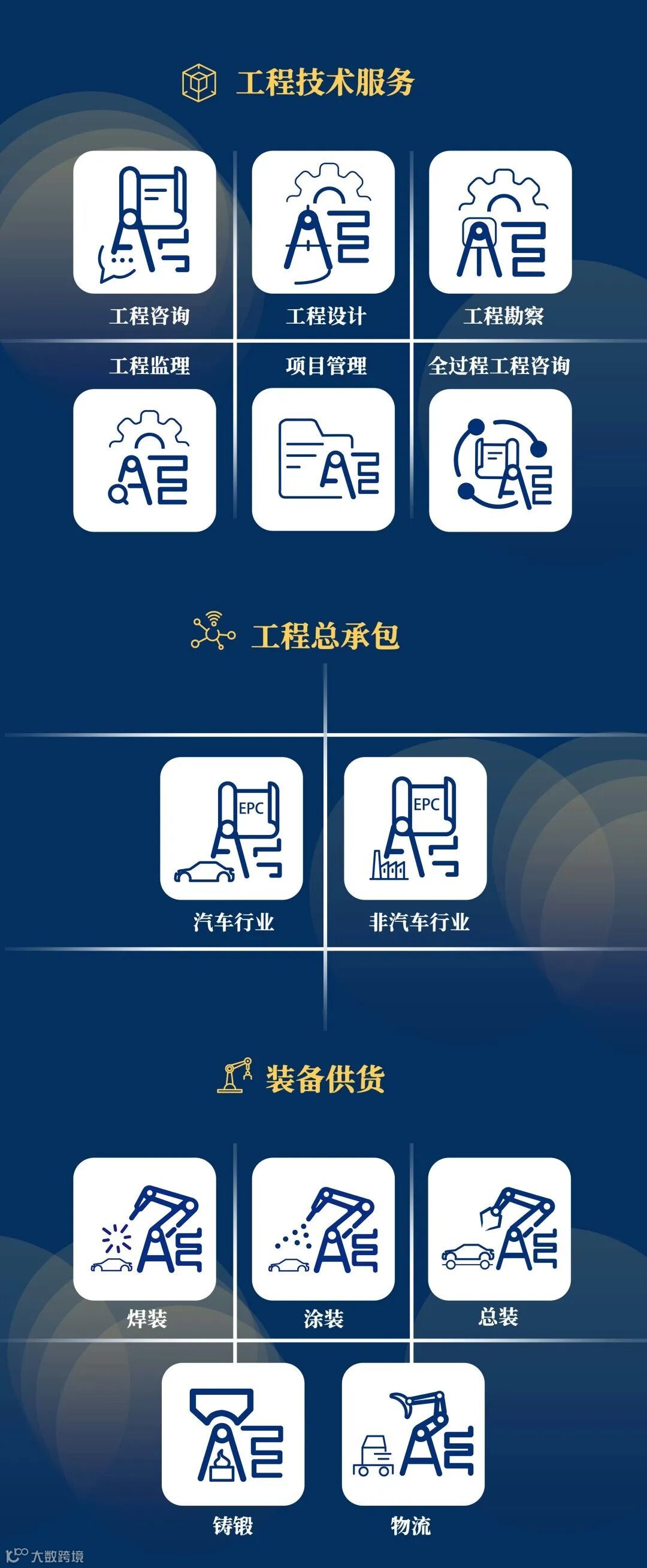 顺应这一趋势,中汽工程逐渐完善了其业务布局,如今已涵盖了工程技术服务(含咨询、设计、勘察、监理、项目管理、全过程工程咨询)、工程总承包、装备供货(焊装、涂装、总装、铸锻、物流)等多项核心业务。